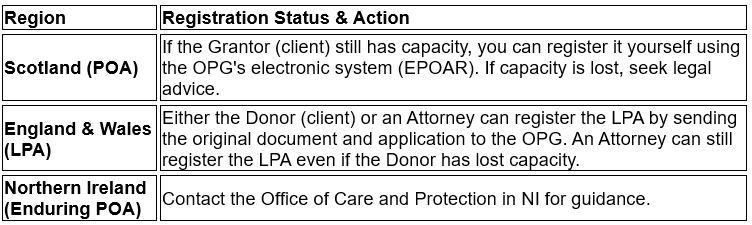 Lasting Power of Attorney (LPA) – Requires registration with the Office of the Public Guardian before it can be used, which adds a layer of security and oversight.